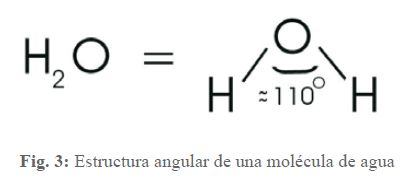 Los dos átomos de hidrógeno forman un triángulo equilátero con el átomo de oxígeno en la punta y forman un ángulo de ~110o, como se muestra en la imagen 3.