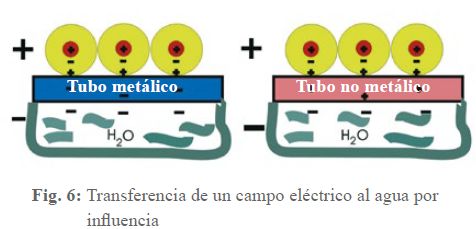 efecto condensador del dispositivo. Si el alambre del devanado se carga aplicando un polo de una fuente de tensión, en la tubería de agua se une por influencia una carga eléctrica de igual magnitud pero de signo opuesto (por el flujo procedente de la tierra).