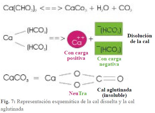 En la imagen 7 se muestran las relaciones. La cal disuelta (hidrogenocarbonato de calcio) se disocia en un ion calcio con doble carga positiva y dos iones hidrogenocarbonato con carga negativa.
