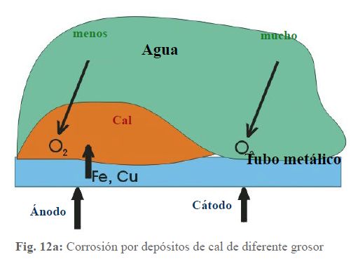 En nuestras tuberías se produce básicamente el mismo proceso, solo que otras causas determinan el diferente acceso de oxígeno a la superficie metálica. En la imagen 12a se representa esquemáticamente esta constelación. Mientras el agua no se trate físicamente, la cal se deposita preferentemente como se ha descrito anteriormente. Esto hace que entre las zonas con fuertes depósitos de cal y las zonas sin cal, o solo con capas protectoras, el contenido de oxígeno del agua, siempre más o menos fuerte, actúe sobre la superficie en diferentes concentraciones. De este modo, se pone en marcha el mismo proceso que en el elemento de ventilación.