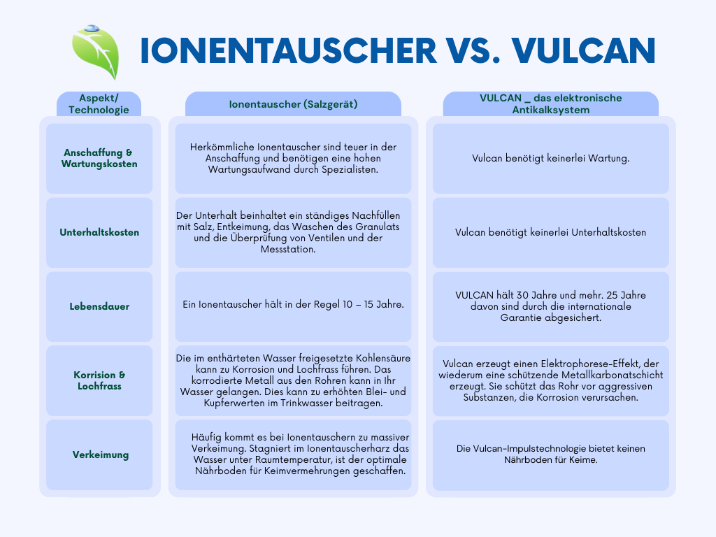Im Gegensatz zu traditionellen Wasserenthärtern, die viele Salze und Chemikalien verwenden, arbeitet Vulcan vollständig ohne diese Zusätze.